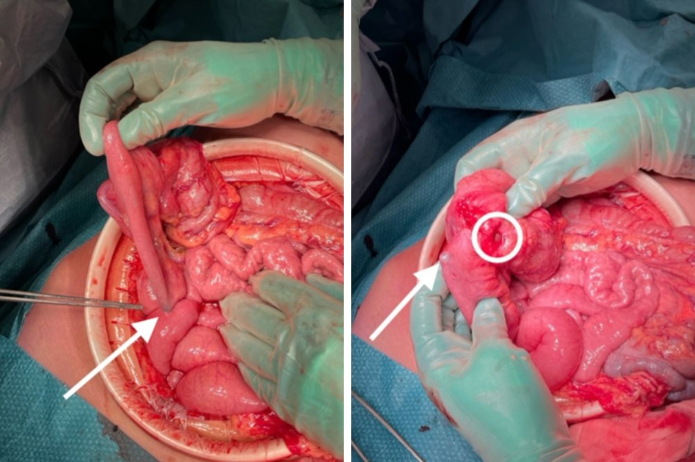 Prva slika s puščico kaže na dva dela črevesja, zlepljena zaradi magnetov. Druga slika prikazuje krog, ki označuje del slepega črevesa, kjer je zaradi pritiska prišlo do odmrtja tkiva, puščica pa kaže na verigo magnetov v spodnjem delu tankega črevesa.