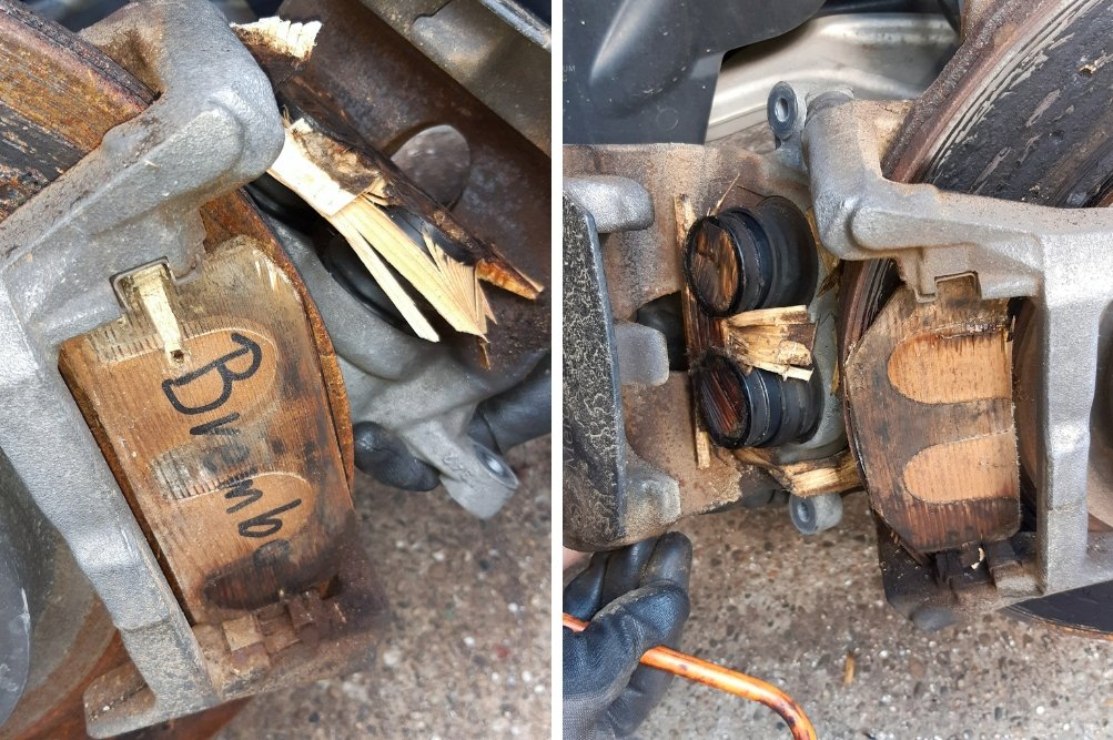So was sieht man nicht alle Tage: Holz statt Bremsbeläge! ???????? Kreativ, aber lebensgefährlich. Bremsen gehören in...