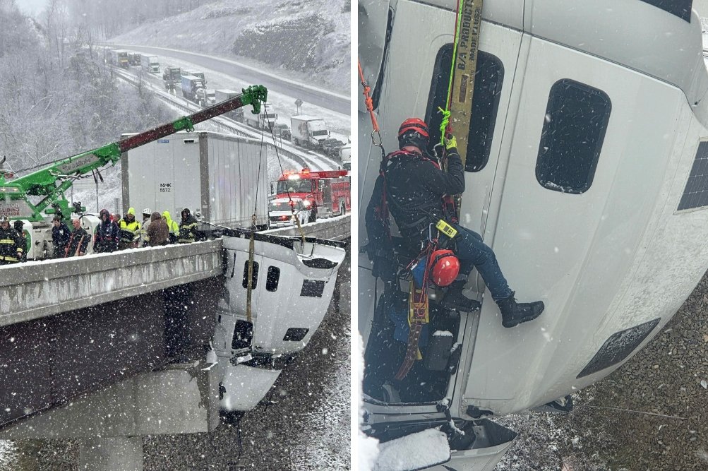 Po poročanju WV MetroNews je na zasneženi avtocesti Route 35 v okrožju Mason v Zahodni Virginiji v torek zgodaj zjutraj prišlo do dramatične nesreče. Voznik 18-kolesnega tovornjaka je zaradi poledice izgubil nadzor, priklopnik je obstal na cesti, kabina pa je prebila ograjo mostu in obvisela približno 30 metrov nad tlemi. V njej je ostal ujet prestrašeni voznik, ki je lahko le čakal, da ga reševalci rešijo iz viseče kabine.