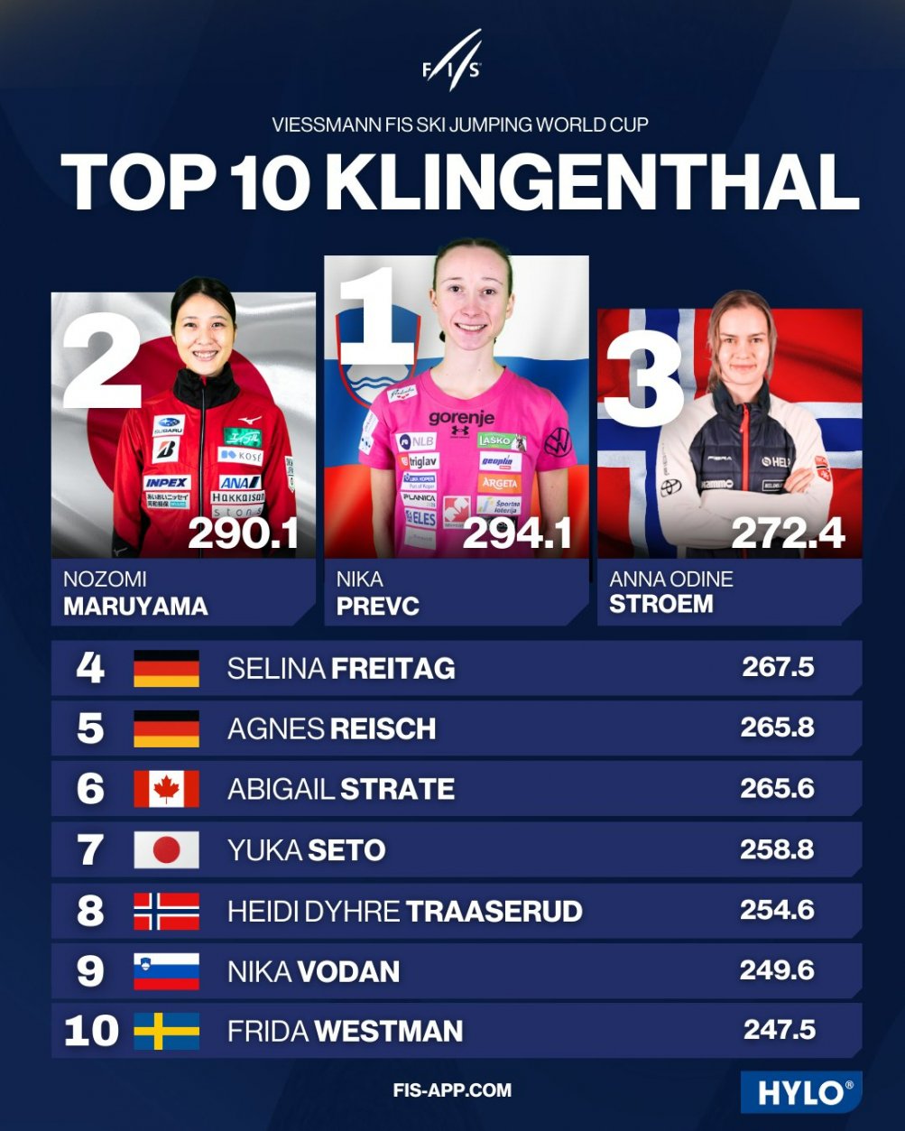 Slovenska smučarska skakalka Nika Prevc (135 in 138 m, 294,1 točke) je zmagala na tekmi svetovnega pokala v Klingenthalu. Druga je bila vodilna v pokalu, Japonka Nozomi Maruyama (134 in 135 m, 290,1), tretja pa Norvežanka Anna Odine Stroem (128,5 in 131,5 m, 272,4). Na osmem mestu je tekmo končala Nika Vodan (123 in 125,5 m, 249,6).