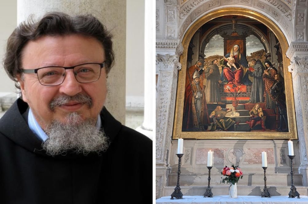 Guardian pater Janez Šamperl in vrnjena oltarna pala Vittoreja Carpaccia 'Marija z Detetom na prestolu in svetniki – Mati upanja'.