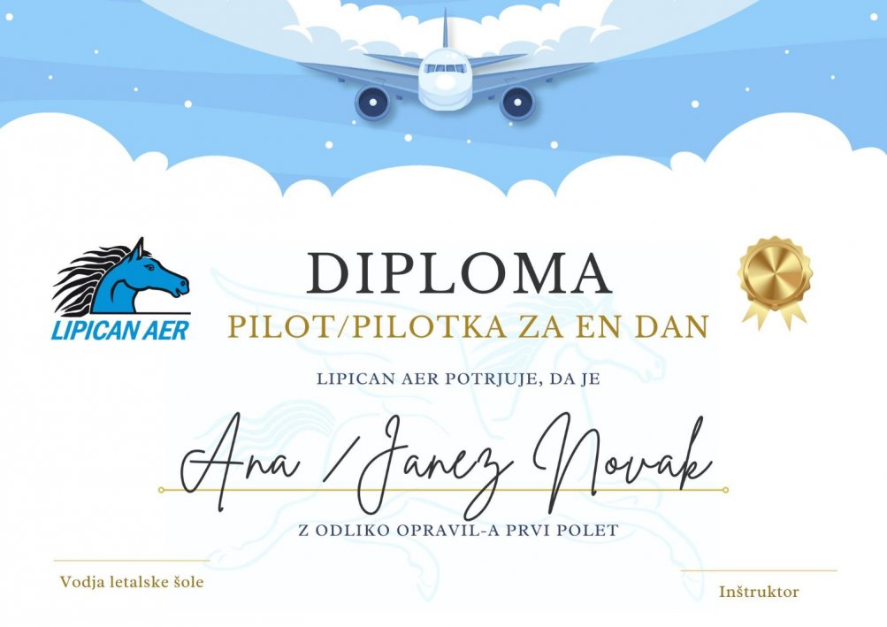 Po poletu prejmete osebni certifikat oziroma diplomo, s katero lahko ponosno pokažete, da ste sedeli za krmilom letala. Na voljo so tudi darilni boni, ki jih lahko kupite na letališču, prejmete po pošti v lični ovojnici ali po elektronski pošti. Bone in diplome ponujajo tudi v otroški oziroma mladinski različici.