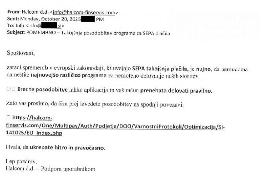 V policiji so v zadnjih dneh prejeli okrog 10 prijav oškodovanja pravnih oseb, pri čemer skupna materialna škoda znaša več kot milijon evrov. Spletni goljufi so izkoristili informacijo o uvedbi takojšnjih plačil, pripravili e-sporočila z lažno vsebino o nujni posodobitvi in se lažno predstavljali v imenu družbe Halcom.