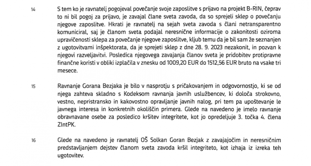 Kot so sporočili iz KPK, so aprila 2024 prejeli prijavo zoper ravnatelja OŠ Solkan Gorana Bezjaka, ker si je povečal zaposlitev. KPK je pregledala dokumentacijo in ugotovila, da je Bezjak konec septembra 2023 sklical sejo sveta zavoda OŠ Solkan, ki jo je tudi vodil. Na seji je predlagal, da se njegova zaposlitev poveča za 7,5 odstotka, ker naj bi bil to pogoj za sodelovanje šole na projektu B-RIN.