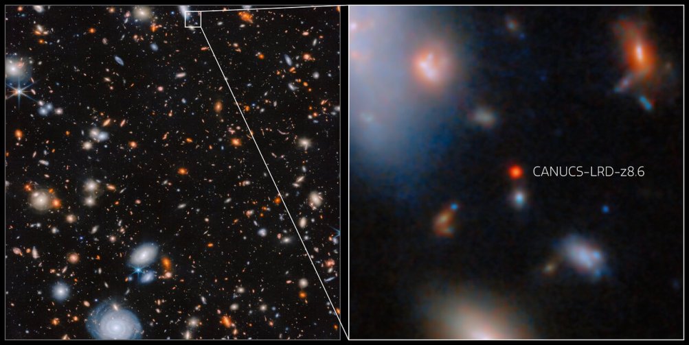 Odkritje galaksije CANUCS-LRD-z8.6 prinaša pomemben korak k razumevanju teh pojavov. Spektralne značilnosti, ki jih je s svojimi zmogljivostmi omogočil teleskop James Webb, so razkrile tudi prisotnost črne luknje, ki hitro raste in močno vpliva na razvoj svoje gostiteljske galaksije.
