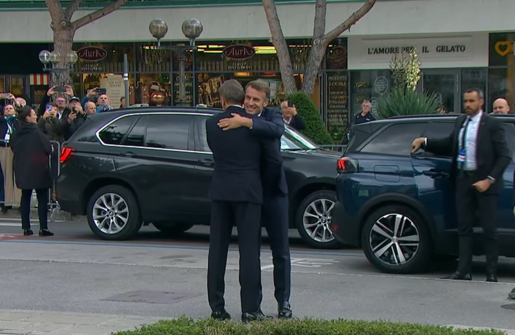 Kot zadnji je na prizorišče prispel francoski predsednik Emmanuel Macron. Golob ga je, sicer edinega, pričakal ob cesti, nato sta se rokovala in objela ter skupaj sprehodila.