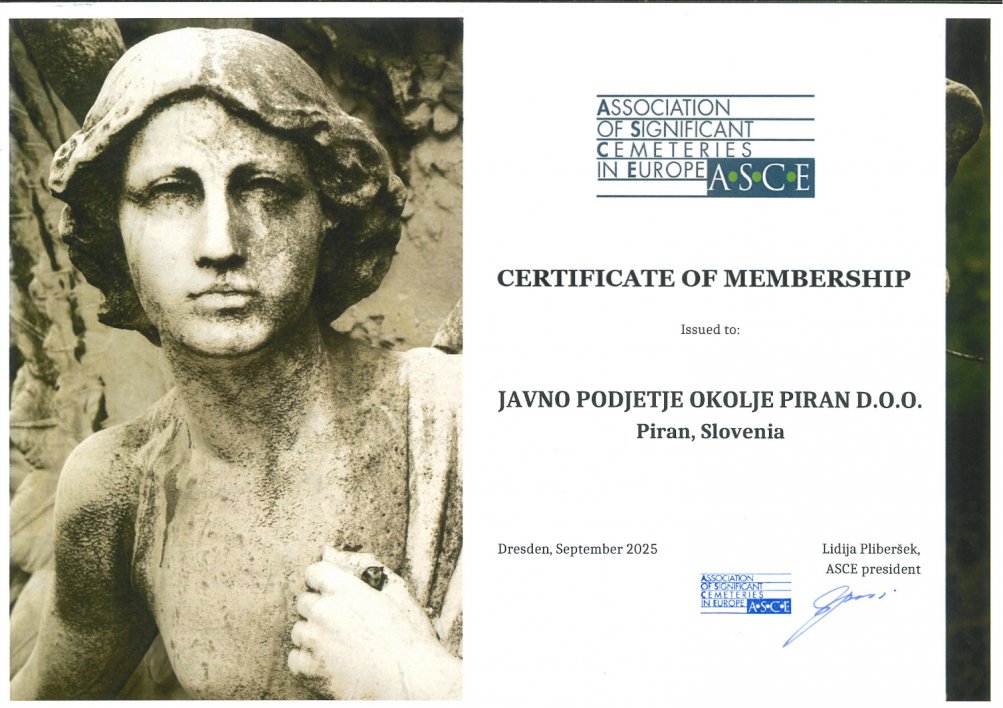 Piransko mestno pokopališče je po pomladanski formalni vključitvi sedaj prejelo tudi uradni certifikat o članstvu v Združenju pomembnih pokopališč v Evropi (ASCE), ki povezuje več kot 180 zgodovinsko in umetniško pomembnih pokopališč iz 28 držav.