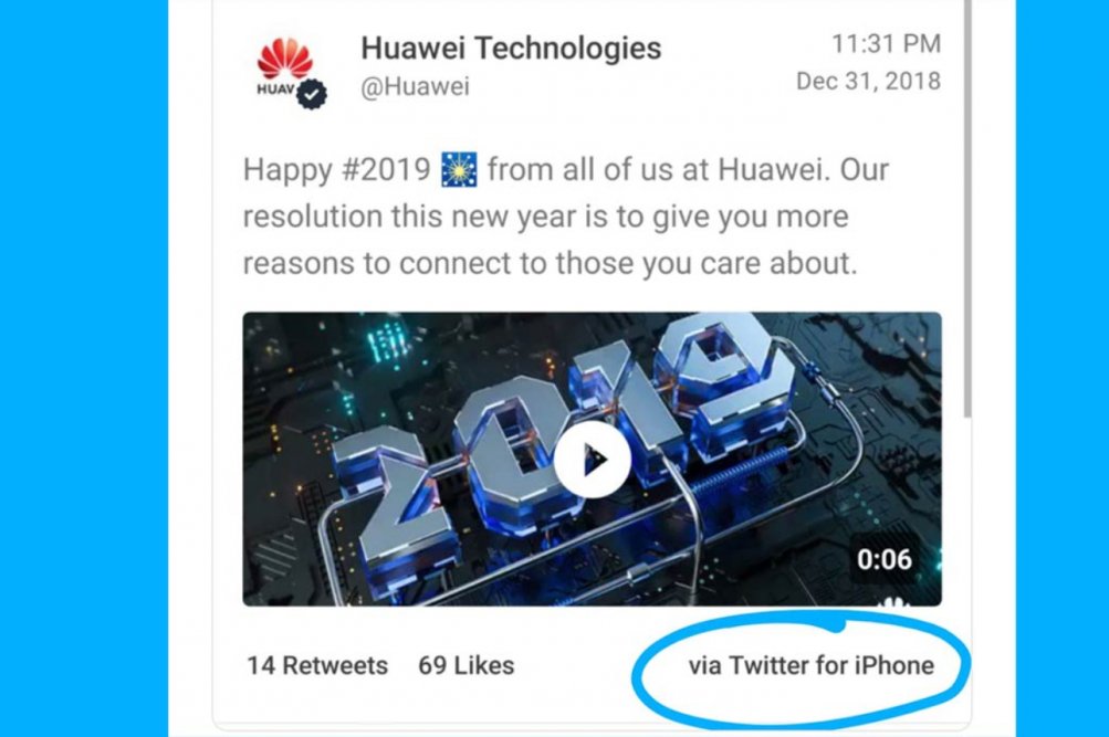 Kitajsko podjetje je svojim sledilcem za novo leto voščilo s tvitom "Happy #2019", ker pa Twitter beleži tudi, s katere naprave je bil tvit objavljen, je bilo ob tvitu objavljeno tudi "via Twitter for iPhone". To je bila za Huawei kar precejšnja blamaža. Čeprav so sporni tvit relativno hitro zbrisali in ga zamenjali z "via Twitter Media Studio", pa je video producent Marques Brownlee še pred tem naredil posnetek zaslona (na sliki zgoraj) in ga delil s svojimi tremi milijoni sledilcev.